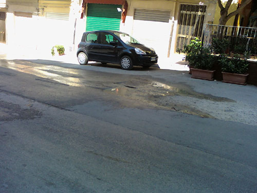 In via Senatore Sammartino nei pressi del Supermercato Euro Despar di fronte la pizzeria Rose Rouge, insiste da parecchio tempo un serio pericolo per motociclisti e automobilisti.