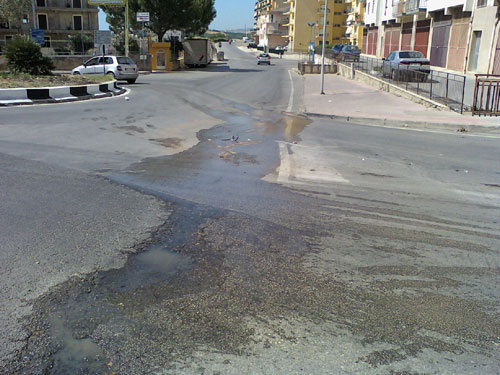 Un trato di strada presenta una buca e un pezzo di strato impraticabile dal quale ogni volta che viene erogata l’acqua fuoriesce il prezioso liquido fino a formare un rigagnolo che arriva fino alla rotatoia. Questo ha già provocato parecchi incidenti.