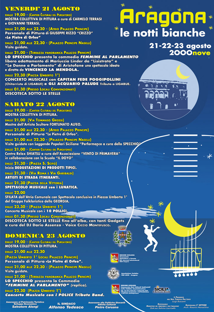 “Un weekend fitto di interessanti proposte, che terrà sveglia la Città, regalando svago e divertimento a tutti senza mai perdere di vista le finalità della manifestazione nata- spiega il sindaco di Aragona Alfonso Tedesco- per risvegliare dal torpore un centro storico ricco di storia, generoso d’arte e di cultura”.