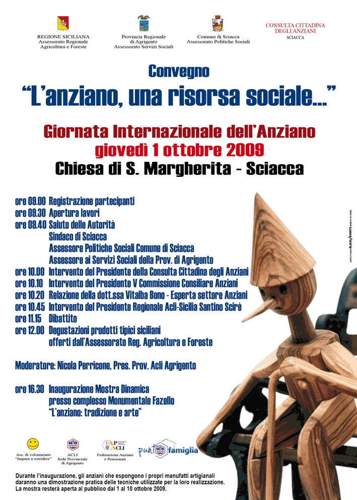 Si terrà a Sciacca, domani 1 ottobre 2009, presso la chiesa Santa Margherita il convegno “l’anziano una risorsa sociale….”. Nel pomeriggio verrà inaugurata, presso il complesso Monumentale Fazello, la Mostra Dinamica “L’anziano: tradizione e arte” che sarà aperta al pubblico dal 1 al 10 ottobre 2009. L’evento è stato patrocinato dal comune di Sciacca, Assessorato Politiche Sociali, dalla Provincia Regionale di Agrigento, Assessorato Servizi Sociali e dall’Assessorato Agricoltura e Foreste Regione Siciliana.