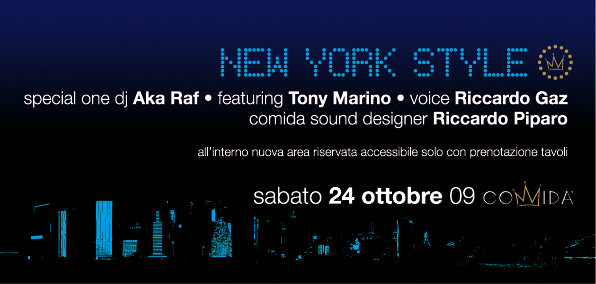 Il Comida organizza per sabato 24 ottobre l’evento New York Style, il preserata, che avrà inizio alle 22 in giardino, sarà animato dal dj-music selector A.K.A. Raf ‘n’ Soul featuring Tony Marino.