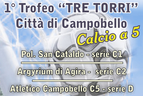 In occasione delle festività natalizie, l’Atletico Campobello C5, Associazione Sportiva Dilettantistica senza scopo di lucro, con il patrocinio dell’Assessorato allo Sport del comune di Campobello di Licata e la collaborazione con l’ACSI Comitato Provinciale di Agrigento, organizza un triangolare di calcio a 5 denominato “I° Trofeo Tre Torri – Città di Campobello di Licata”. Detta manifestazione si svolgerà il 29 Dicembre 2009 alle ore 18.00 a Campobello di Licata, presso il campetto comunale, sito in Via Luigi Giglia adiacente lo stadio comunale “Tre Torri”.