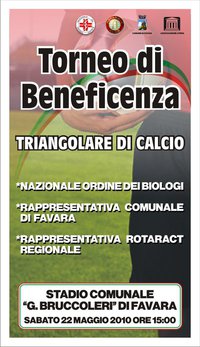Altra importante iniziativa dei Rotaract Club del Distretto 2110 Sicilia-Malta fortemente impegnato sul nostro territorio. E’ stato infatti organizzato per Sabato 22 Maggio alle ore 15:00, allo Stadio Comunale G. Bruccoleri di Favara, un Triangolare benefico in favore dei familiari delle vittime del tragico crollo che ha colpito una palazzina di Favara il 23 Gennaio 2010, causando, purtroppo, la morte delle due sorelline Bellavia. All’iniziativa, hanno immediatamente aderito, con grandissimo entusiasmo, la Rappresentanza di Amministratori e Consiglieri Comunali della cittadina favarese e, la Nazionale Biologi. Il Torneo, vedrà le 3 squadre protagoniste sfidarsi in 3 mini tempi da 30 minuti ciascuno. L’incasso conseguito, con libera offerta, pertanto, verrà interamente devoluto alla famiglia colpita da questa terribile tragedia. La grande disponibilità dei partecipanti all’evento e l’ennesima conferma sulla bontà e l’importanza del service rotaractiano, è stata sottolineata dal Presidente del Club di Canicattì Virginia Milano, tra le principali promotrici della manifestazione, la quale ha anche sottolineato come, per contribuire alla positiva realizzazione dell’iniziativa, ogni club, ha stanziato una somma di denaro ad integrazione di quello che sarà raccolto con il contributo di tutti i partecipanti.