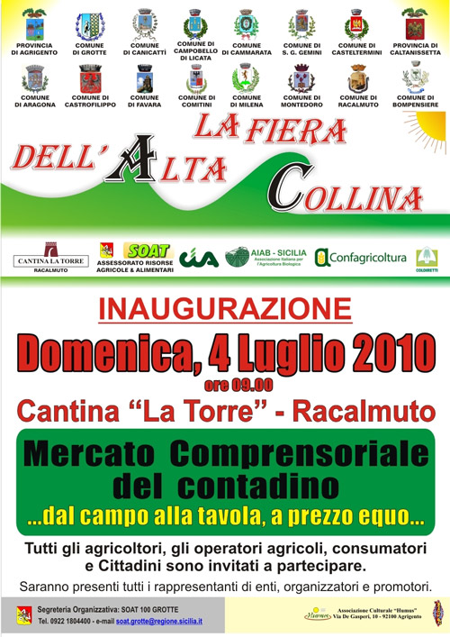 Tutto pronto per la prima domenica della “Fiera dell’Alta collina” organizzata da alcuni Comuni delle province di Agrigento e Caltanissetta. Un mercato comprensoriale del contadino che si terrà, a partire da domenica 4 luglio, tutte le prime domeniche del mese presso la Cantina sociale “La Torre” di Racalmuto. In collaborazione con le sigle di categoria della provincia (Cia, Confagricoltura, Coldiretti), l’Aiab Sicilia e l’Associazione “Humus”, i sindaci dei Comuni invitano i produttori a partecipare al mercato, dove al suo interno si svolgeranno iniziative culturali e di promozione del territorio. L’inaugurazione si terrà domenica alle 10 alla presenza dei sindaci dei Comuni di Grotte, Racalmuto, Castrofilippo, Comitini, Aragona, Bompensiere, Montedoro, Campobello di Licata, Favara, Canicattì, Milena, San Giovanni Gemini, Casteltermini, Cammarata. Partecipano all’iniziativa le Province Regionali di Agrigento e Caltanissetta.