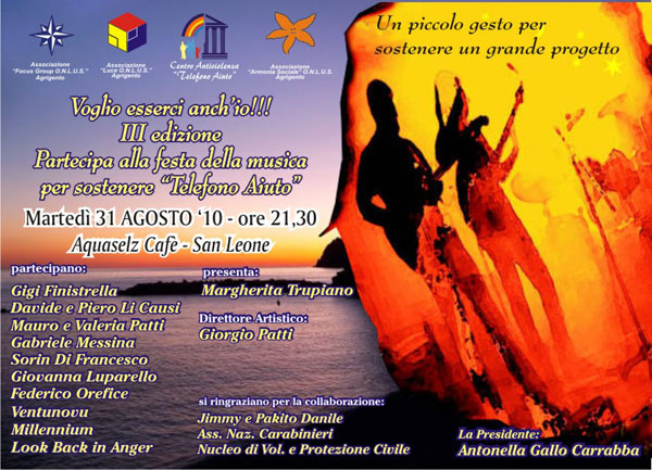 Si comunica che MARTEDI’ 31 Agosto 2010 alle ore 21,00 presso il locale Acqua Seltz di San Leone si terrà la terza edizione della manifestazione per sostenere il Centro Antiviolenza Telefono Aiuto”. Denominata “Voglio esserci anch’io”, promossa dall’Associazione “Focus Group” Onlus, dall’Associazione Luce Onlus e dall’Associazione Armonia Sociale Onlus.