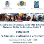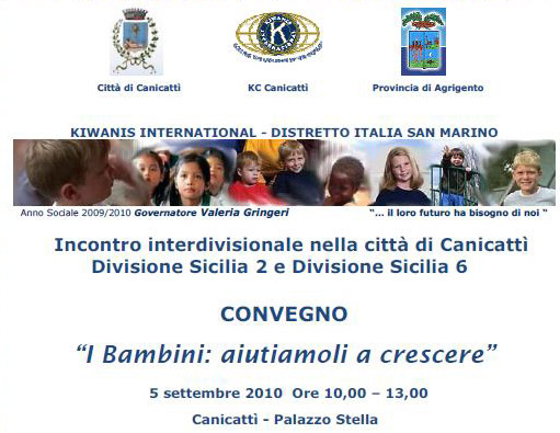 Il 5 settembre p.v. alle ore 10,00 a Canicattì,nei saloni di Palazzo Stella, avrà luogo il Convegno : “I Bambini: aiutiamoli a crescere”, organizzato dalle Divisioni Sicilia 2 e Sicilia 6 del Kiwanis International Distretto Italia San Marino, col patrocinio del Comune di Canicattì e della Provincia di Agrigento. Club ospitante il Kiwanis Club di Canicattì. Il tema del Convegno è in sintonia con la mission kiwaniana, il cui motto è “serving the children of the world” e gli argomenti che saranno trattati vogliono invitare a riflettere sul difficile processo della crescita dei bambini e sul ruolo che hanno la famiglia, la scuola, le istituzioni e il contesto sociale. Dopo i saluti del Presidente del club di Canicattì , Dott. Salvino Asaro, delle autorità civili e dei luogotenenti governatori delle due Divisioni, Dott. Pippo Geremia (Sicilia 2) e Prof.ssa Rosalba Fiduccia (Sicilia 6), relazioneranno: