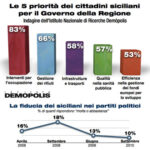 I siciliani, da mesi, percepiscono una profonda disattenzione del Governo nazionale verso il Sud, ma avvertono anche – con preoccupazione – una grave stasi nell’azione di governo a livello regionale e nella gestione dei fondi strutturali comunitari destinati alla Sicilia. In crollo verticale appare la fiducia dei cittadini nelle istituzioni politiche e nei partiti, considerati incapaci di formulare progetti innovativi e proposte credibili di governo per il futuro della Regione.