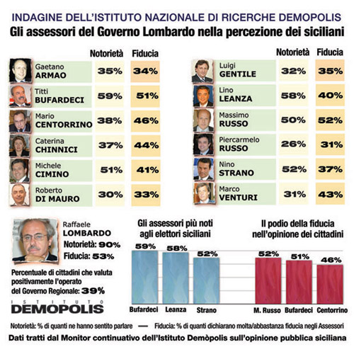 In tale difficile contesto, rimane tendenzialmente alta, al 53%, la fiducia personale dei siciliani nel presidente della Regione Raffaele Lombardo, ma nel contempo risulta piuttosto critico il giudizio sull’operato complessivo del Governo regionale: soltanto il 39% dei cittadini esprime infatti oggi una valutazione positiva su quanto è stato fatto negli ultimi mesi.