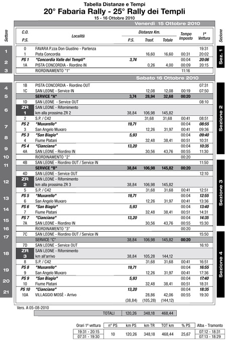 Venerdì 9 ottobre si chiudono le iscrizioni. Venerdì 15 ottobre gli equipaggi effettuano lo shakedown sul tratto SP3 Favara-Crocca, (ore 10-14.30). Nella stessa giornata, ore 8.30-13.30, in programma le verifiche sportive e tecniche al Palacongressi-Villaggio Mosé. Alle ore 19.30 del venerdì sera, nel centro storico di Favara (Piazza Don Giustino), la cerimonia di partenza. Gli equipaggi, pochi minuti dopo, daranno spettacolo sui 3740 metri della spettacolare speciale-show lungo la pista karting Concordia. Dopo la “Valle dei Templi”, equipaggi e vetture osserveranno la pausa notturna per tornare a sfidarsi il giorno dopo: Sabato 16 Ottobre sono, in programma tre prove speciali da ripetere tre volte. Si tratta della “Muxarello” (km. 19,71), della “San Biagio” (km.5,93) e della Cianciana (km.13,20). Tra un giro e l’altro, il Riordino – Parco Assistenza in programma in riva al mare di San Leone di Agrigento, in un amplissimo spazio molto comodo per team, scuderie ed appassionati.