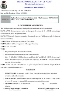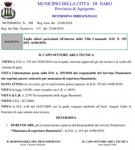 Vi sono due determine, che trovate in allegato, nella quale prima si finanziano soldi per il taglio dei rami pericolanti, poi si annulla la delibera per mancanza di fondi; pero’ la settimana scorsa il sindaco ha concesso un contributo di 10.000 euro per andare in germania lui compreso.
