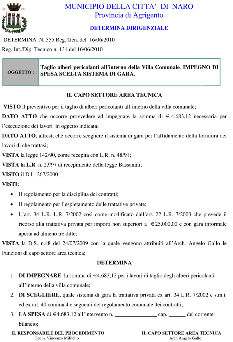 DETERMINA N. 355 Reg. Gen. del 16/06/2010