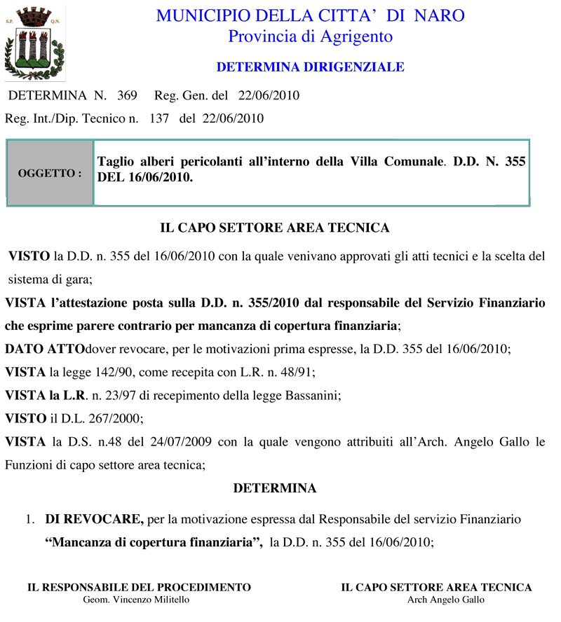 DETERMINA N. 369 Reg. Gen. del 22/06/2010