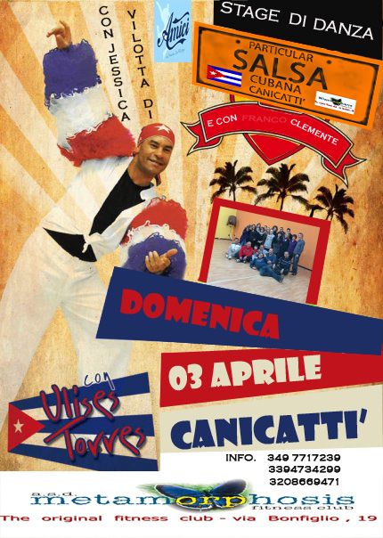 Domenica 3 aprile, presso la Palestra Metamorphosis di via Bonfiglio a Canicattì, (locali ex Conad) si terrà uno stage di Danze cubane con il maestro Ulises Torres e Jessica di Amici. Tutti i salseri della Sicilia, a partire dalle 15, potranno seguire lo stage del grande trascinatore cubano Ulises.