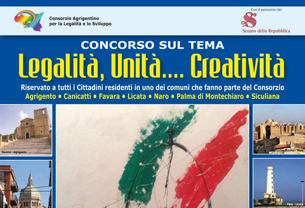 Il Consorzio Agrigentino per la Legalità e lo Sviluppo, a cui aderiscono i Comuni di Agrigento, Canicattì, Favara, Licata, Naro, Palma di Montechiaro e Siculiana, bandisce un concorso sul tema “Unità, Legalità … Creatività”, diviso in quattro sezioni, di cui una appositamente riservata a tutti gli alunni delle scuole primarie e secondarie di 1° grado, per opere di disegno-pittura, fotografia-video e brevi racconti e poesie.