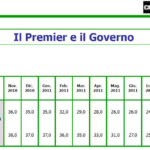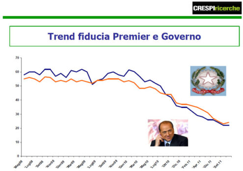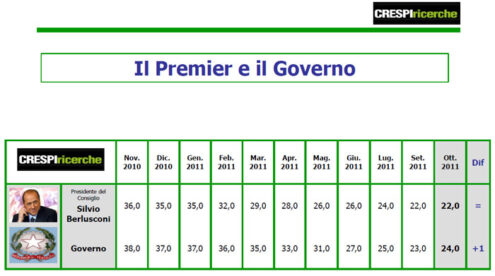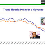 IL PREMIER E IL GOVERNO – La fiducia nel premier Silvio Berlusconi e’ ai minimi storici, ma risulta stabile al 22%. Per quanto riguarda il governo, invece, dopo oltre un anno torna a crescere facendo registrare un +1% che porta la fiducia al 24%.