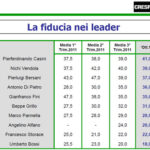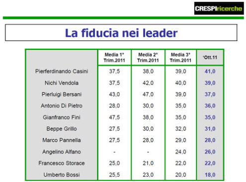 L’istituto demoscopico Crespi Ricerche di Luigi Crespi, ha reso noto un nuovo sondaggio sulla fiducia nei leader di partito, nel governo e nel premier. Casini risulta il piu’ amato tra i leader, ai minimi ma stabile la fiducia in Berlusconi, risale leggermente il governo.