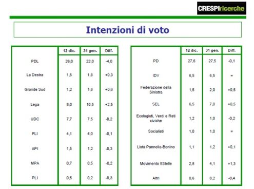 L’istituto Crespi Ricerche, diretto da Luigi Crespi, ha diffuso gli ultimi dati dell’Osservatorio politico che evidenziano una perdita di consensi, rispetto all’ultima rilevazione del mese di dicembre 2011, dei grandi partiti come Pdl (-4%) e Pd (-0,1%). I dati del sondaggio politico sulle intenzioni di voto ci spiegano come si comporterebbero gli italiani se si andasse a votare oggi.