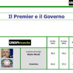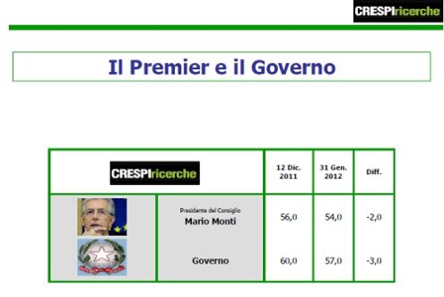 FIDUCIA NEL GOVERNO – Stando alle ultime rilevazioni effettuate dall’Istituto diretto da Luigi Crespi la fiducia degli italiani nel Governo Monti è in calo, passa dal 60 al 57 %: in calo anche la fiducia nel premier che passa da quota 56 al 54%.