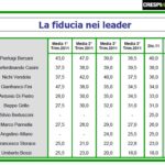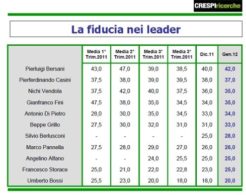 FIDUCIA NEI LEADER – L’Osservatorio Politico del mese di Gennaio di Crespi Ricerche rende noti anche i consensi riscossi dai leader di partito. Al primo posto c’è Pierluigi Bersani (Pd) al 42% seguito da Pierferdinando Casini (Udc) al 37%, Nichi Vendola (Sel) e Gianfranco Fini (Fli) al 35% .A seguire: Antonio Di Pietro (Idv) al 34%; Beppe Grillo (Movimento cinque stelle) al 33%; Silvio Berlusconi al 28%; Maro Pannella al 26%; Angelino Alfano al 25%; Francesco Storace (La Destra) al 25% e Umberto Bossi al 20%.