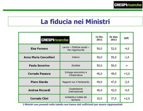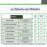 FIDUCIA NEI MINISTRI – Il calo di fiducia nei confronti del Governo Monti, registrato dallo studio di Crespi Ricerche, investe inevitabilmente anche i singoli ministri che perdono consensi rispetto alla rilevazione di dicembre. Elsa Fornero (Lavoro) perde il 4%, arrivando a quota 52%; Anna Maria Cancellieri (Interno) al 55% (-1); Paola Severino (Giustizia) stabile al 50%; Piero Giarda (Rapporti con il Parlamento) al 47% (-2); Andrea Riccardi (Cooperazione internazionale) perde il 4%, passando dal 46 al 42% di gradimento. Crescono solo Corrado Passera (+3%) e Corrado Clini (+2%).