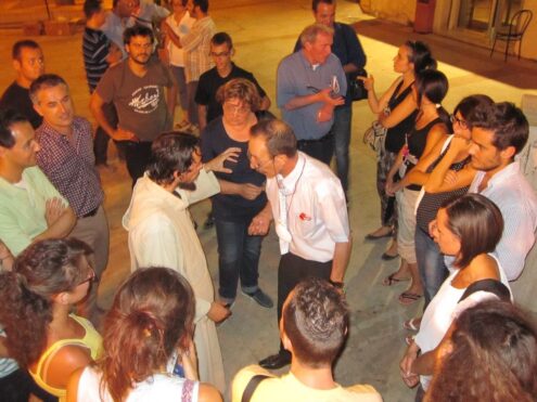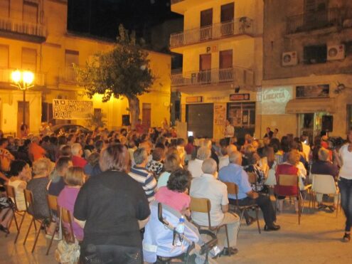 Quando “ disonorare la mafia diventa una questione d’onore” può generarsi un paradossale fenomeno: quello per cui si comincia a combattere la mafia NON solo a parole. Detto di un giornalista, un professionista della parola che, se particolarmente esperto e fantasioso, ne diventa un giocoliere, può suonare strano; ancora di più lo diventa, se poi, si parla di Pino Maniaci, direttore di Telejato, un vero maniaco dei giochi di suono e il cui innegabile turpiloquio si presta con destrezza a raccontare la turpe, squallida e anche ridicola realtà mafiosa, in qualità di direttore di Telejato, la più piccola emittente del mondo che con due ore di notizie e servizi propone il telegiornale più lungo al mondo. Accostare il “risus” alla mafia sembra un’operazione folle, ma il 9 luglio scorso, a Ravanusa, in piazza XXV aprile, nella serata inaugurale dei Lunedì nei cortili, parlando ora di stragi ora di catture si è tanto, tanto riso. Ad essere ridicolizzati i personaggi di Domenico Raccuglia e Giovanni Brusca. Chi sono? Il primo, il killer che disciolse nell’acido il piccolo Giuseppe Di Matteo e che al momento della cattura, spaventato dal rumore delle armi imbracciate dai carabinieri, scappava sui tetti per poi gridare: “Sugnu nnuccenti” (Sono innocente). Il secondo, il killer che ha azionato il telecomando nella strage di Capaci, ma che dopo “quattro pugni presi in galera” si è presto pentito. “Ma chisti su li mafiusi di cui nni scantammu?” (Sono questi i mafiosi di cui ci spaventiamo?) Non è stato lo spettacolo di un cabarettista, né lo show del solito comico che a pagamento vende l’esecrabile riadattato all’intrattenimento, ma il racconto di chi guarda in faccia alla mostruosa realtà mafiosa con la sola arma dell’obiettivo e arriva a filmare con essa quello che la “telecrazia” italiana odierna non osa neppure fotografare. Una riflessione in questo senso è stata stimolata anche dalle due immagini visualizzate dagli schermi voluti da padre Emanuele Casola, promotore dell’incontro, e anteposti dinnanzi alla platea degli spettatori, l’uno rappresentante un imbuto, simbolo della TV che riempie senza che si possa reagire, l’altro rappresentante un punto interrogativo, simbolo di una TV che ci interroga e ci mette in crisi. Così laddove la dittatura della telecrazia durante la settimana distoglie con i gossip e il sabato fa piangere a pagamento, Telejato porta le sue telecamere alle nozze della figlia di Totò Riina, che avvolta da un sontuoso abito in seta con ricami impreziositi da perle, sfila verso la chiesa tra elegantissimi parenti le cui consorti erano “carricati a sceccu” da gioielli presto nascosti all’occhio dell’obiettivo, mentre una splendida automobile del valore di centinaia di migliaia di euro s’imponeva maestosa a simbolo del disagio patito da una famiglia ufficialmente di nullatenenti, nullatenenti che continuano ad abitare la Sicilia, mentre la Sicilia si spopola di giovani e risorse.