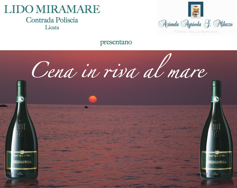 In abbinamento al menu, a tutto pesce, sarà servito il vino VIGNAVELLA dell’Azienda Agricola G. Milazzo di Campobello di Licata.