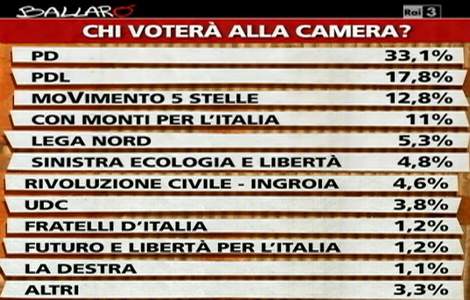 Nuovo sondaggio realizzato da Ipsos, realizzato per la trasmissione Ballarò di Giovanni Floris. Secondo i dati, illustrati da Nando Pagnoncelli, rispetto alla scorsa settimana, non siamo in presenza di particolari cambiamenti di scenari fare le due coalizioni. Le distanze fra il Pd e il Pdl restano invariate con il partito di Pier Luigi Bersani che si attesta al 33,1% mentre il partito di Silvio Berlusconi è a quota 17,8%.