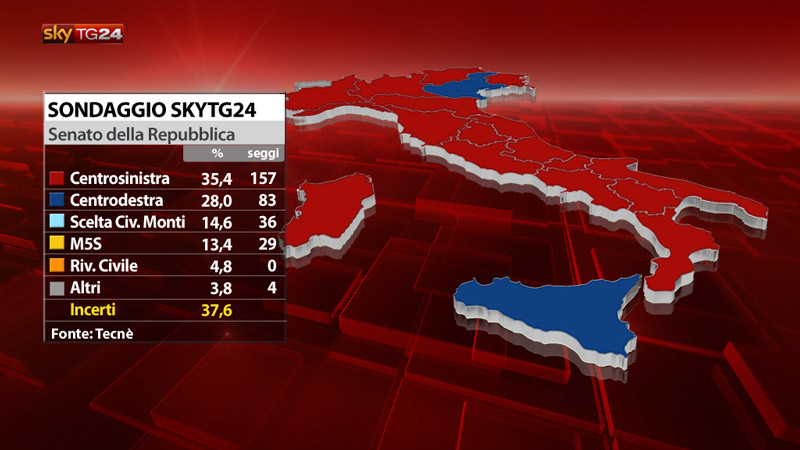 Con il solo Veneto (37,3% contro 28,3%) dato quasi per certo di sponda Pdl, l’altro possibile successo “azzurro” sarebbe quello della Sicilia. L’Isola governata dal presidente Rosario Crocetta è oggi estremamente in bilico: 28,1 % al centrodestra, 27,6 % al centrosinistra e i 5 stelle – primo partito alle regionali – al 21,1 %. Insomma la mappa del Senato, secondo Tecnè e Sky, potrebbe dunque essere questa: 157 seggi alla coalizione di Bersani e Vendola, 83 seggi alla coalizione di Silvio Berslusconi, Mario Monti e centro otterebbero 36 seggi, il MoVimento 5 stelle di Beppe Grillo avrebbe 29 seggi, agli altri partiti toccherebbero 4 seggi.