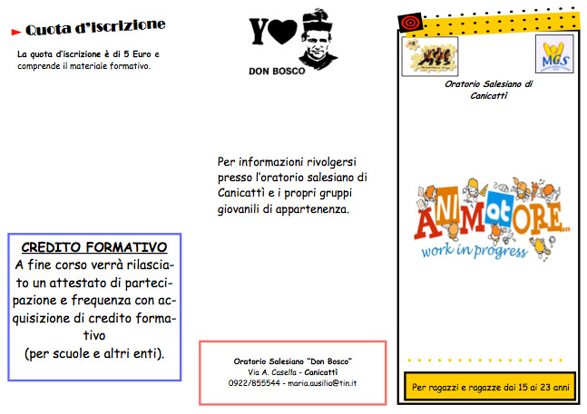 L’ oratorio Salesiano “Don Bosco” di Canicattì con la collaborazione delle associazioni di volontariato della città organizzano la scuola animatori cittadina “Animatori work in progress”.