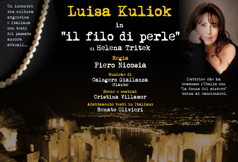 Il 21 Luglio 2013 al Teatro Antico di Taormina nella rassegna di TAORMINA ARTE in scena IL FILO DI PERLE con Luisa Kuliok Regia Piero Nicosia – L’attrice che ha commosso l’Italia con “La donna del mistero” torna ad emozionarci con un monologo con musiche dal vivo, un incontro teatrale tra cultura italiana e argentina con testi del passato ancora attuali.