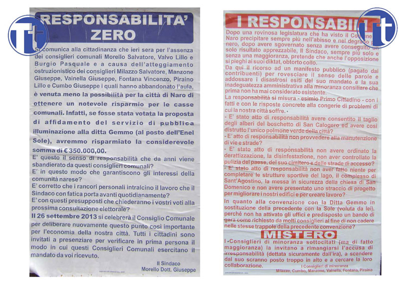 Naro, I consiglieri del gruppo di minoranza replicano mediante un manifesto pubblicato domenica 29 Settembre 2013 reso pubblico per le vie del paese a tutti i cittadini. In merito ad un precedente manifesto affisso nei giorni precedenti l’ultimo consiglio comunale firmato dal sindaco della città Pippo Morello, ove definisce i membri del consiglio comunale “Irresponsabili”. Quanto scritto, dalla minoranza, mette in risalto sia una maggiore pressione fiscale sui nuclei familiari naresi, in questo periodo di ristrettezza economica, che le promesse fatte in campagna elettorale e non ancora realizzate. Le video interviste ai consiglieri di minoranza Lillo Piraino e Giuseppe Cumbo.
