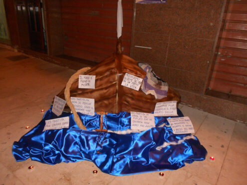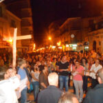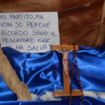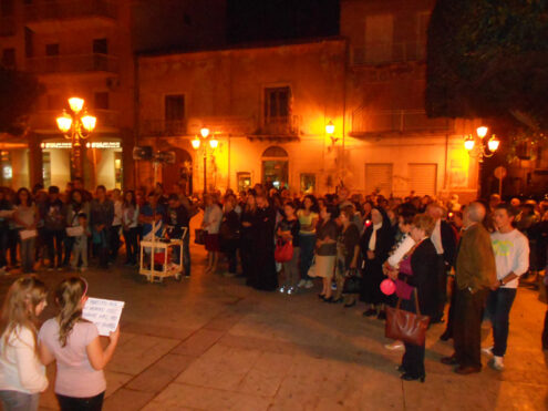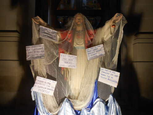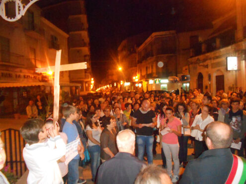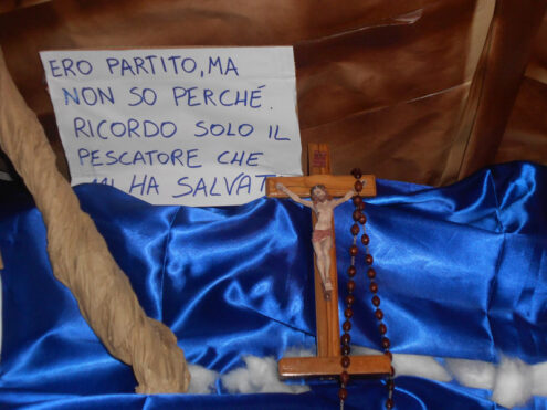 A questo punto sarebbe stato molto interessante poter registrare i pensieri passati nella mente di quanti insieme a noi, quel venerdì sera, in Piazza I Maggio, si sono soffermati dinnanzi alla Chiesa Madre. Sul sagrato, attirava l’attenzione dei fedeli, accorsi per partecipare alla commemorazione e al corteo, una statua del Cuore di Gesù con le braccia spalancate verso il mondo e completamente avvolta, anzi intrappolata in una rete da pescatore. Mentre qualcuno iniziava a dare voce dal megafono alle parole dei migranti, “Ero partito con papà che voleva che potessi frequentare una scuola, ero partita per capire come aiutare la mia gente, ero partito perché, dopo anni di duri sacrifici per acquistare il biglietto, avrei finalmente iniziato una nuova vita”, il Cristo sembrava invocare aiuto, proprio come uno dei tanti naufraghi di Lampedusa, che, mentre ingoiava acqua e ne riempiva i polmoni fino a soffocare, pensava di poter con quel viaggio essere finalmente considerato un uomo, nel pieno diritto di raggiungere la felicità.