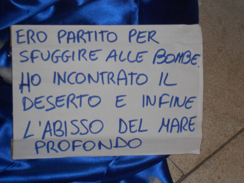 “Ero partito per sfuggire alla miseria, nel mio bagaglio solo tanta speranza; ero partita per strappare alla violenza il figlio della violenza; ero partito per vivere senza la paura di poter morire ogni giorno; ero partita con la mia mamma che voleva che avessi da mangiare tutti i giorni; ero partito per essere considerato finalmente una persona, ora sono solo un numero”.