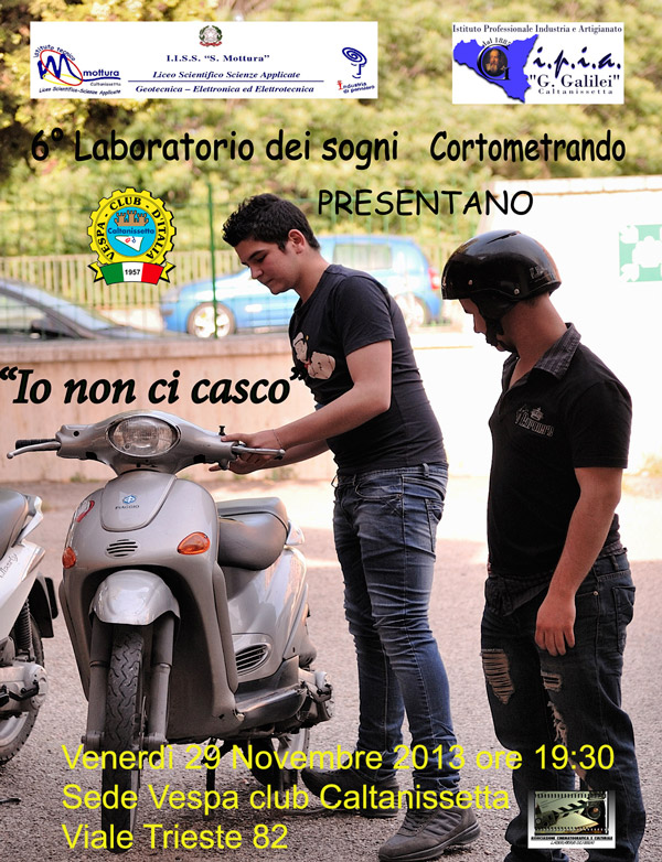 Il Vespa Club Caltanissetta in collaborazione con l’Associazione Cinematografica e Culturale “Laboratorio dei Sogni” e il patrocinio dell’Iiss “Mottura e Ipia “Galilei”” Venerdì 29 novembre 2013 alle ore 19,30 , proietterà nella sede del Vespa Club Caltanissetta viale Trieste, un cortometraggio realizzato dagli alunni dell’I.I.S.S. “Mottura” di Caltanissetta nell’anno 2011 sulla sicurezza stradale dal titolo “IO NON CI CASCO” premiato a Sanremo al Global Educational Festival (Festival Internazionale della creatività nella scuola).