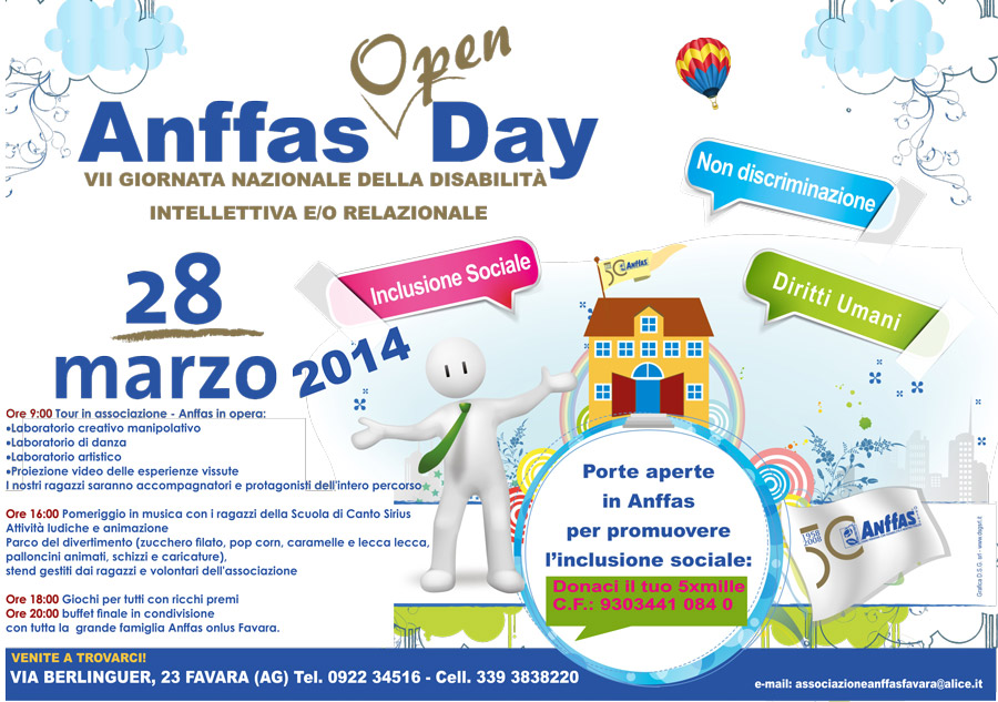 Venerdì 28 marzo 2014 ricorre la gionata nazionale di Anffas (associazione nazionale di persone con disabilità intellettiva e relazionale e le loro famiglie) per l’occasione presso la nostra sede sita in Viale Berlinguer, 23 a Favara “Anffas Open Day”. Un ricco programma ci attende in condivisione con tutti coloro che vogliono incentivare l’inclusione sociale, il sostegno dei diritti umani e la non discriminazione .