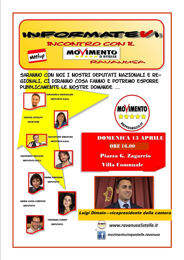 A Ravanusa si terra’ domenica 13 alle ore 16.00 un evento con la presenza di alcuni deputati Nazionali e regionali (vedi locandina evento), spiegheranno ai presenti le iniziative intraprese e ci sara’ spazio per porre domande da parte dei cittadini che lo riterranno.