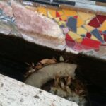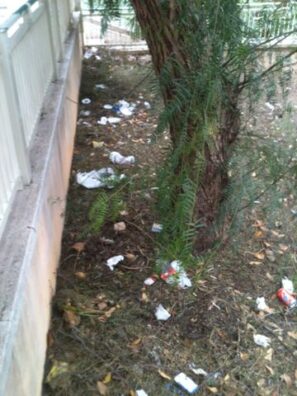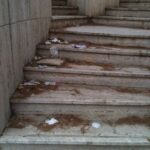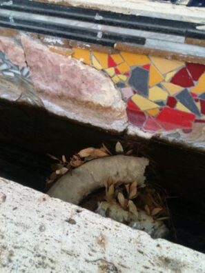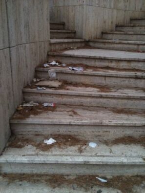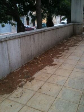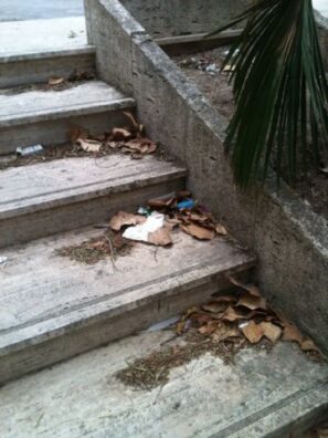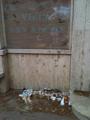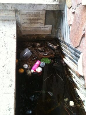 Nella fontana dove vi è un mosaico realizzato dall’artista Silvio Benedetto, l’acqua ristagnate è diventata un ricettacolo di potenziale cause di infezioni data la presenza nella stessa di animali morti, rifiuti e sporcizia varia.