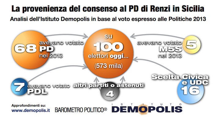 L’Istituto diretto da Pietro Vento ha analizzato la provenienza del consenso odierno al PD in Sicilia in base al voto espresso alle Politiche: su 100 elettori delle Europee, i due terzi avevano già votato il PD nel 2013. 5 su 100 avevano scelto il M5S, 7 il PDL, 16 Scelta Civica o l’UDC; 4 su 100 provengono da altri partiti. Significativa appare nell’Isola anche la convergenza nel PD dell’area di Articolo 4.