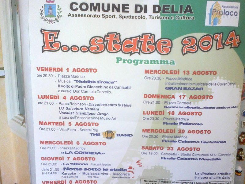 Anche quest’anno via libera all’E…state deliana, grazie alla partecipazione del Comune che riesce a trovare i fondi nonostante la difficile condizione finanziaria in cui versa, tramite un supporto economico di 7000 euro. Il programma consiste in una serie di eventi ludici e di spettacoli che intratterranno la popolazione dal 1 al 23 agosto. L’esordio in Piazza Madrice con un musical su padre Gioachino, “Nobiltà eroica”, a cura di Don Carmelo Carvello. Lunedì 4 agosto avrà luogo la discoteca sotto le stelle nel Parco Robinson, mentre a seguire martedì 5 si esibiranno i “The nail band”, gruppo pop locale. Mercoledì 6 si svolgerà l’attesa “Corrida”, e il giorno seguente, dopo la tradizionale “‘ntinna”, si svolgerà la “Notte sotto le stelle”, serata che prevede contemporaneamente e in tre luoghi diversi il karaoke, musica dal vivo e la discoteca, mentre alla fine della serata ci saranno due postazioni in cui si potranno osservare le stelle col telescopio. Martedì 12 agosto altro musical a cura di Don Carvello, dal titolo “Un prete rivoluzionario” sul beato Giacomo Alberione, il 13 la Piazza Madrice si colorerà di allegria per l’esibizione dei “Gran Bazar”, cover band di Canicattì. I tornei sportivi sono previsti per venerdì 8 agosto col torneo calcio tennis, lunedì 18 con la finale di pallavolo, mercoledì 20 con l’incontro di calcetto femminile e, infine, sabato 23 con la finale di calcetto maschile.