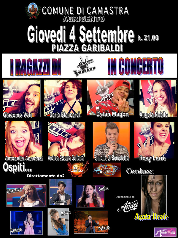 concerto-4-settembreCamastra in fermento per l’evento musicale dell’anno, giovedì 4 settembre alle ore 21 presso la piazza garibaldi, in occasione dei festeggiamenti del Santo Patrono, si esibiranno i ragazzi dei talent show  the voice, io canto e ti lascio una canzone.