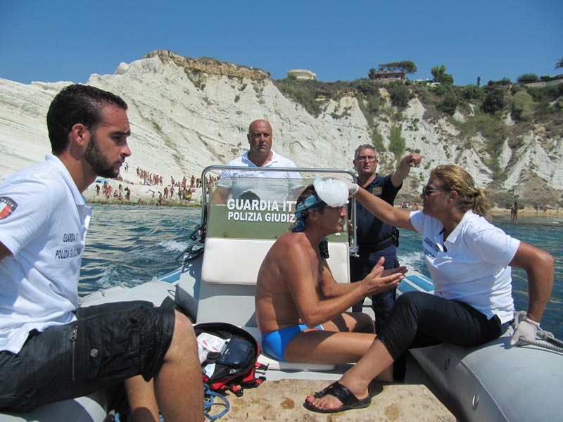 Il turista è stato soccorso e tratto in salvo dagli uomini della Polizia Provinciale comandati dal ten Col. Vincenzo Giglio e dai volontari delle Associazioni, i quali dopo i primi soccorsi lo hanno trasportato con il gommone delle Guardie Ittiche al porto di Porto Empedocle dove, allertata telefonicamente, c’era ad attenderlo il Comandante in seconda della Capitaneria di Porto Pietro Carosia e un’ambulanza del 118.