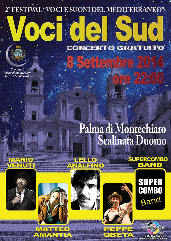 l Comune di Palma di MontechiaroAG, Terra del Gattopardo, ospiterà il giorno 8 settembre 2014 alle ore 22 in occasione delle celebrazioni della festa patronale con Mario Venuti, Lello Analfino, Matteo Amantia e Beppe Qbeta, eccezionalmente a Palma tutti assieme in un unica serata e sullo stesso palco