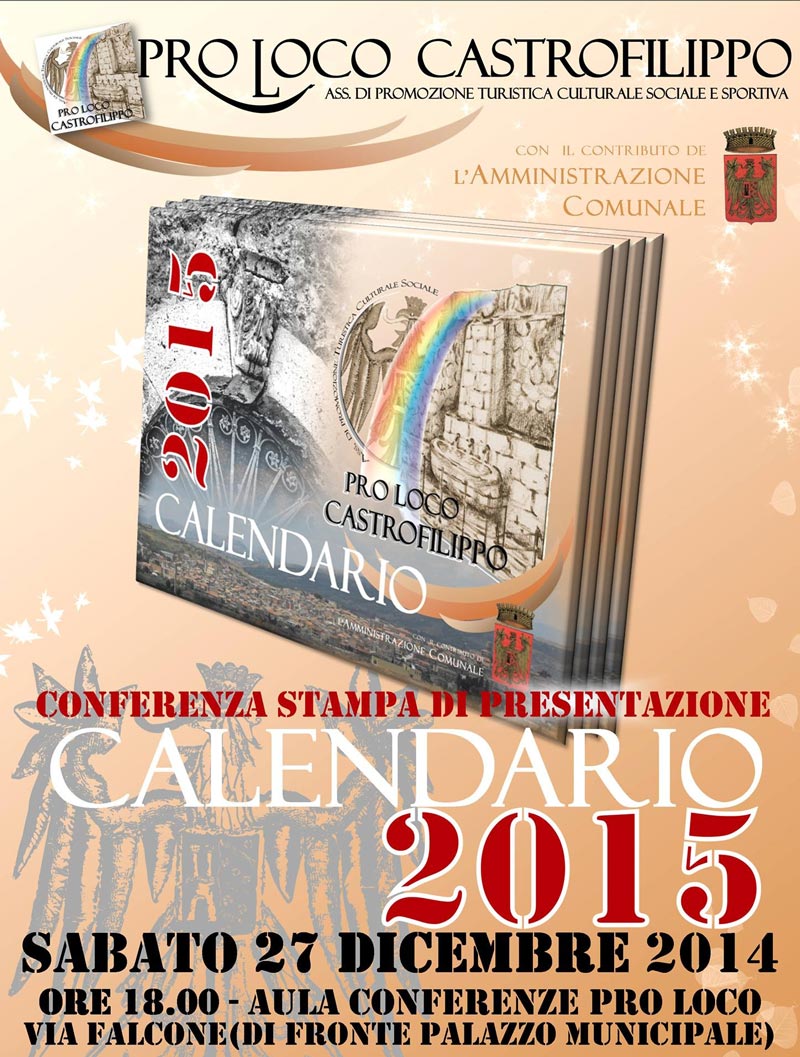 Verrà presentato sabato 27 dicembre p.v. Alle ore 18 presso la sala conferenze di via Falcone (di fronte palazzo municipale) il calendario della Pro Loco Castrofilippo edizione 2015. Ripercorrendo il filone delle passate edizioni, il calendario vuole promuovere e far riscoprire le testimonianze artistiche e architettoniche del territorio cittadino attraverso una selezione di immagini che raccoglie elementi noti ed elementi ancora da scoprire. L’iniziativa vanta quale partner d’eccezione l’Amministrazione Comunale di Castrofilippo che ha colto l’iniziativa promuovendone la realizzazione al fine di esaltare l’identità locale.