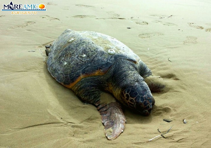 L’ultima mareggiata ha spiaggiato una grossa tartaruga Caretta – Caretta sulla spiaggia di Giallonardo. A ritrovarla i volontari dell’associazione ambientalista MareAmico di Agrigento. L’animale non anellato era lungo più di un metro e largo 60 centimetri, probabilmente sarà morto negli scorsi giorni e le onde l’hanno spinto sull’arenile.