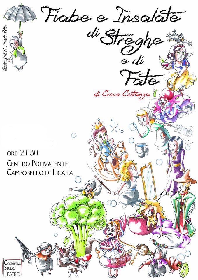 Fiabe e insalate di streghe e di fate è uno studio teatrale scritto e diretto da Croce Costanza. L’autore, attraverso un linguaggio drammaturgico che esalta la musicalità della parola con rime, assonanze e allitterazioni, riscrive, rendendo comiche e a tratti paradossali, le storie dei personaggi delle più famose fiabe che, in questa versione teatrale, si mischiano, si incontrano e si scontrano dando vita a situazioni esilaranti. I personaggi non sono esattamente quelli patinati delle fiabe. Certo è che tutti sono un po’ sopra le righe, e tuttavia in ognuno è possibile scorgere una verità, almeno nelle intenzioni del loro agire, che potrebbe farli apparire perfettamente reali .