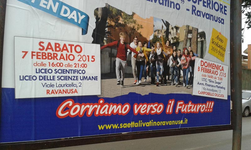 “CORRIAMO VERSO IL FUTURO” è lo slogan scelto dal Liceo Scientifico e Liceo Scienze Umane “Giudici Saetta e Livatino” di Ravanusa per le attività di orientamento in occasione delle iscrizioni all’anno scolastico 2015/2016 degli alunni provenienti dalla scuola media. Per tale motivo è stata organizzata dai docenti e dagli studenti una giornata di riflessione aperta ai ragazzi che devono compiere la scelta della scuola superiore e ai loro genitori. Durante l’ OPEN DAY che si svolgerà il 7 Febbraio 2015 dalle ore 16,00 alle ore 21,00 nei locali della sede centrale in Viale Lauricella 02 Ravanusa i partecipanti potranno visitare i locali, conoscere i docenti ma soprattutto partecipare ad alcuni laboratori didattici tematici per comprendere meglio i percorsi formativi sia curriculari che extra curriculari che il Liceo “Giudici Saetta e Livatino” offre al territorio compreso tra Ravanusa, Campobello di Licata, Canicattì, Sommatino. I genitori e gli alunni che parteciperanno potranno assistere ad alcune perfomance artistiche e musicali preparate dagli studenti del Liceo. Durante la stessa giornata i genitori che lo chiederanno potranno ricevere ulteriori informazioni sulle modalità d’iscrizione e sulle discipline presenti nei piani di studio. Una equipe di docenti di diverse discipline saranno a disposizione per ogni chiarimento ed approfondimento. A partecipanti sarà offerto un rinfresco e un gadget
