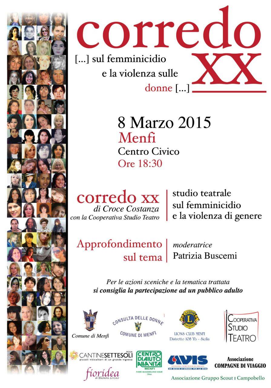 Domenica, 8 marzo 2015 alle ore 18.30, a Menfi, presso il “Centro Civico” della città, la CST –Cooperativa Studio Teatro porta in scena CORREDO XX studio teatrale sul femminicidio e la violenza sulle donne, scritto e diretto da Croce Costanza.