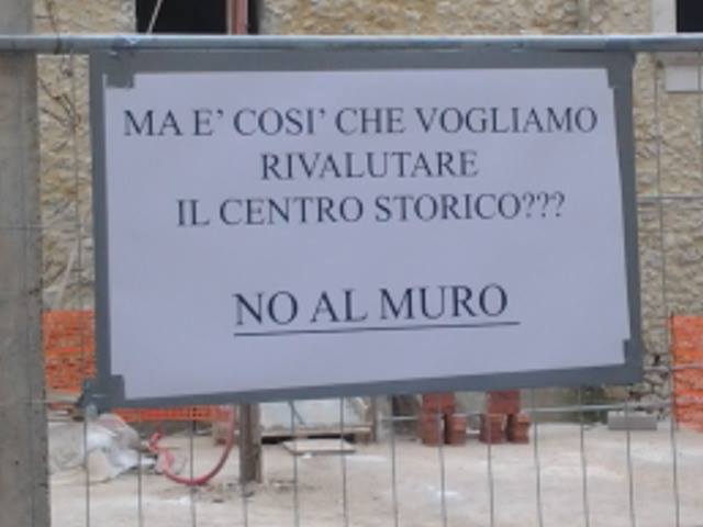 Purtroppo non ci bastano le pallide repliche affidate al vicesindaco il quale, visibilmente imbarazzato, ha ammesso di condividere lo sdegno dei cittadini con la conclusione però che quel muro deve essere fatto. E non ci bastano le voci da bar che circolano in questi giorni in paese del tipo: “a tutto c’è rimedio… il muro oggi c’è, domani si potrà buttar giù”.