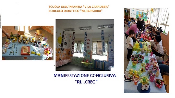 Giorno 28, Maggio nella scuola dell’infanzia “V.La Carrubba” si è svolta la manifestazione conclusiva di fine anno scolastico, con il mercatino del progetto “Ri…creo” in occasione del quale sono stati esposti e venduti oggetti realizzati con materiale di recupero. Inoltre si è tenuta una mostra dei lavorori ottenuti nell’ambito del progetto “Attività pomeridiane” incentrato quest’anno sui quattro elementi: acqua, aria,terra e fuoco. Il lavoro in sinergia tra insegnanti e genitori ha permesso ancora una volta di trasformare questa giornata in un bel momento di condivisione gioiosa tra grandi e piccini.