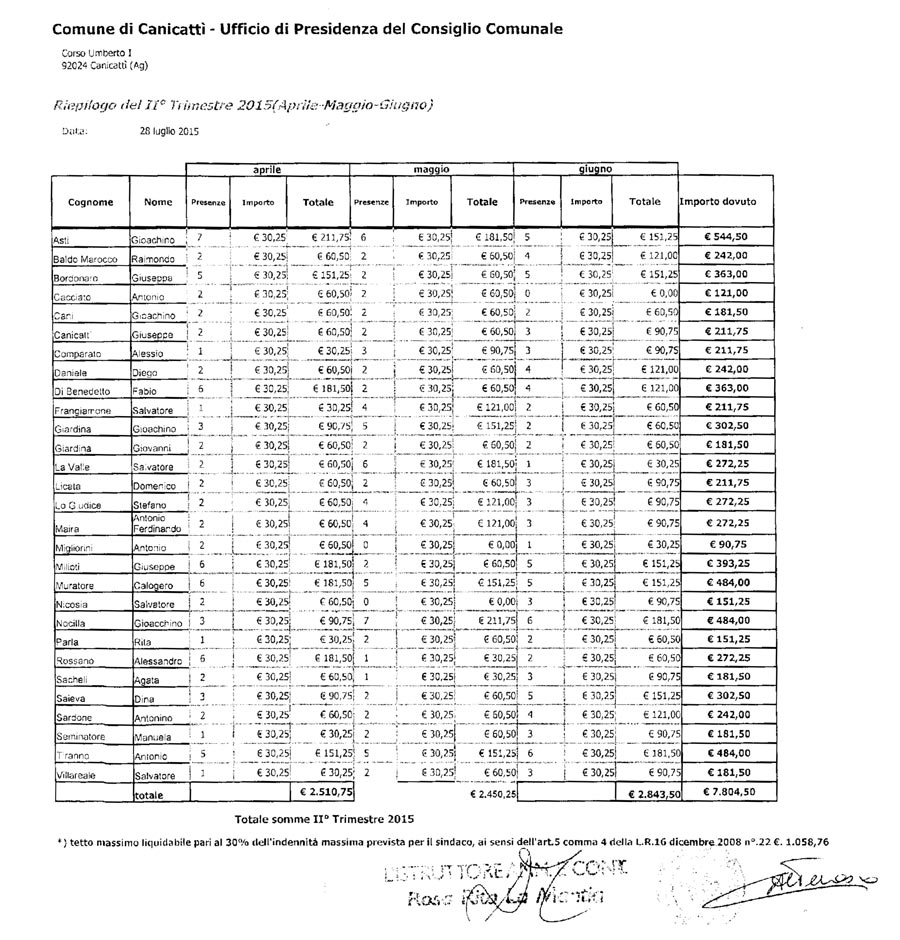 Queste le somme ripartite ad ogni singolo consigliere: